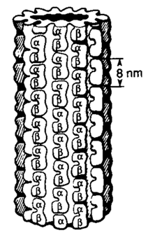 図2。X線結晶構造解析による微小管 (MT) 構造 (Amos および Klug, 1974 年)。チューブリン サブユニットは, α および β モノマーからなる 8 nm の二量体です。