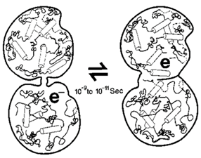 図3。チューブリン二量体タンパク質には, 疎水性領域内の量子イベント(電子移動度, 準粒子フォノン)が 10-9-10-11 秒遷移を伴う構造変化と結合する2つの状態があります。タンパク質内の円筒はαヘリカル領域です