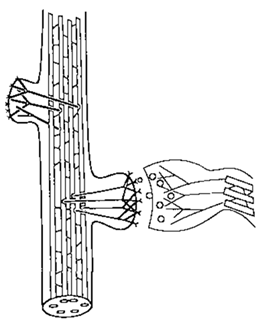 図4。基礎となる細胞骨格構造を示すシナプスの模式図。右: MT-MAPネットワークを持つ軸索末端。シナプス間隙への神経伝達物質小胞(円)の放出に関与するシナプシンフィラメントと接続。左: MT-MAPネットワークを持つ心室樹状突起。細胞骨格構造を持つ2つの樹状突起棘がシナプス膜の受容体と接続。