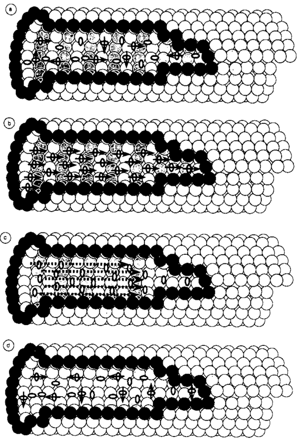 図 5。微小管における超放射プロセスの概略図。矢印のない楕円は, 最低回転エネルギー状態にある水分子を表します。矢印のある楕円は, 最初の励起回転エネルギー状態にある水分子を表します。プロセスは循環的です (a → b → c → d → a → b)。 (a) 微小管内の水分子システムの初期状態。チューブリンの熱変動によるエネルギー増加により, 最初の励起回転エネルギー状態にある水分子の数が増加します。 (b) 回転励起状態にある水分子システムの集団モード。長距離コヒーレンスは, 自発的な対称性の破れによって微小管内で達成されます。(c) 回転励起状態にある水分子のシステムの集団モードは, 集団的にエネルギーを失い, 微小管内の量子化された電磁場にコヒーレント光子を生成します。(d) 超放射によって最初の励起回転エネルギーを失った水分子は, チューブリンの熱変動から再びエネルギーを獲得し始め, 水分子システムは初期状態 (a) を回復します。