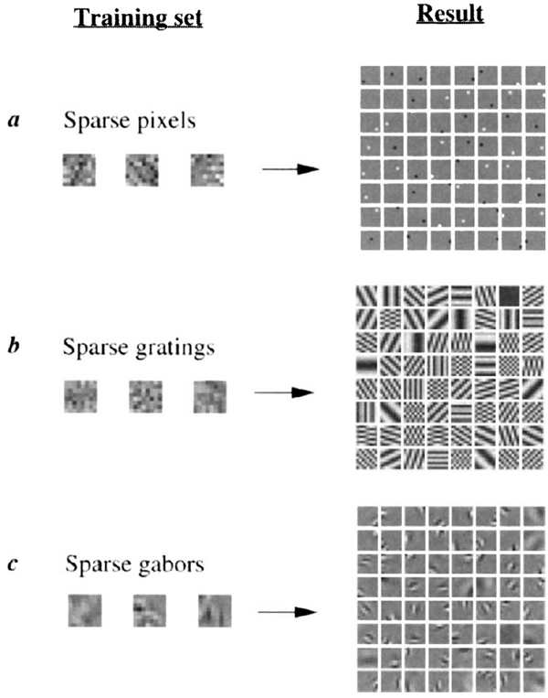 哺乳類の一次視覚皮質における単純細胞の受容野は、空間的に局在し、方向性を持ち1-4、帯域通過性(異なる空間スケールでの構造を選択的に有する)を持つことで特徴付けられ、ウェーブレット変換の基底関数5,6に匹敵します。視覚ニューロンのこのような応答特性を理解するための一つのアプローチは、効率的な符号化7-12の観点から、自然画像の統計的構造との関係を考察することです。この観点から、多くの研究において、自然画像を用いて教師なし学習アルゴリズムを訓練し、同様の特性を持つ受容野を開発しようと試みられてきました13-18。しかし、画像空間全体に広がり、上記3つの特性すべてを含む完全な受容野セットを作成することに成功した研究はありません。本稿では、スパース性を最大化する符号化戦略がこれらの特性を説明するのに十分であるという提案8,12を検証する。自然風景のスパース線形符号を見つけようとする学習アルゴリズムは、一次視覚野に見られるものと同様の、局所的かつ方向性のある帯域通過受容野の完全なファミリーを開発することを示す。結果として得られるスパース画像符号は、出力間の統計的独立性が高いため、後段の処理段階でより効率的な表現を提供する。