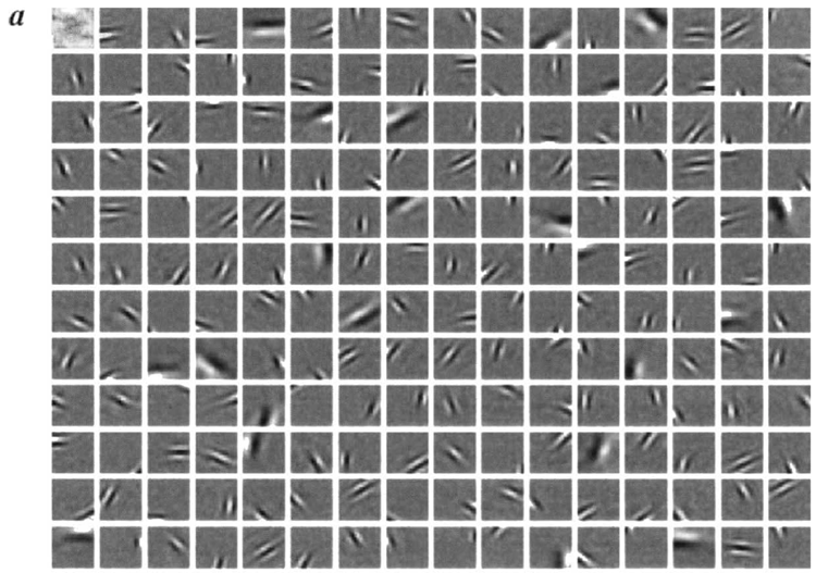 pairwise decorrelated, \(\langle a_ia_j\rangle = \langle a_i\rangle\langle a_j\rangle\). The receptive fields that
