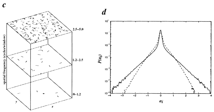 これは単純細胞受容野(約1.5オクターブ、長さ/幅約2)5の特性とほぼ類似している。得られたヒストグラムは疎な分布を示し(図4d)、エントロピーは減少している。