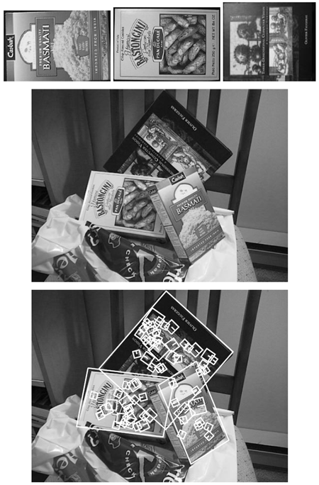 画像から得られたSIFTキーは、最近傍法によるインデックス作成に使用され、候補となる物体モデルを識別します。潜在的なモデルの姿勢に一致するキーの集合は、まずハフ変換ハッシュテーブルを用いて識別され、次に最小二乗近似を用いてモデルパラメータの最終推定値が得られます。少なくとも3つのキーがモデルパラメータに低い残差で一致する場合、物体の存在を示す強力な証拠となります。典型的な物体の画像には数十個のSIFTキーが存在する可能性があるため、画像にかなりのレベルの遮蔽があっても、高い信頼性を維持することが可能です。