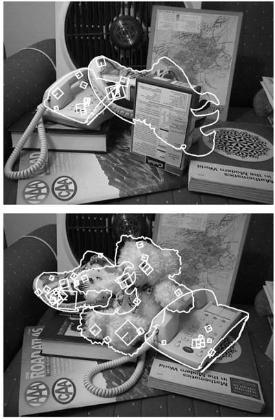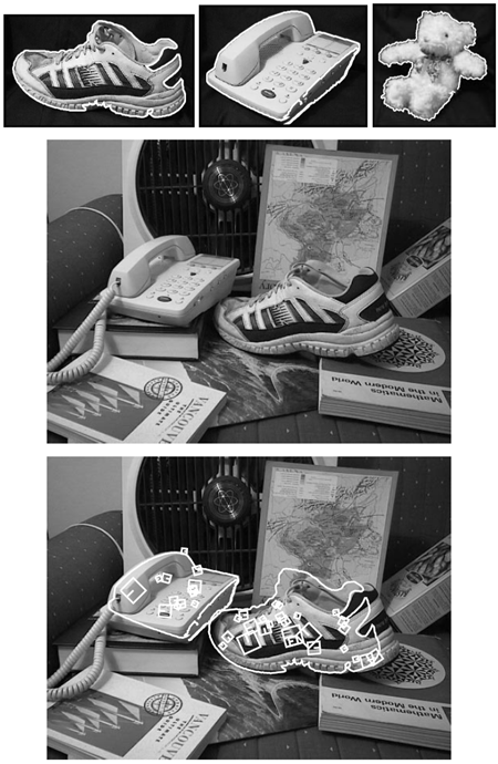 認識性能は、色、テクスチャ、エッジのグループ化、そしてさまざまな特徴のサイズとオフセットを組み込んだ新しいSIFT特徴タイプを追加することでさらに向上します。スケール不変のエッジグループ化は、局所的な図地識別を可能にし、背景の乱雑さが他の特徴に干渉する可能性のある物体境界において特に有用です。インデックス作成と検証のフレームワークにより、あらゆる種類のスケールと回転不変の特徴を単一のモデル表現に組み込むことができます。最大限の堅牢性は、多くの異なる特徴タイプを検出し、インデックス作成とクラスタリングを利用して特定の画像で最も有用な特徴を選択することにより実現されます。