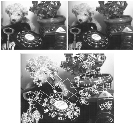 SIFTキーの照明不変性は図6に示されています。2枚の画像は同じシーンを同じ視点から撮影したものですが、最初の画像は左上から、2枚目は中央右から照明されています。最初の画像をモデルとして2枚目の画像を識別するために、完全な認識システムが実行され、2枚目の画像は最初の画像と一致するものとして正しく認識されました。