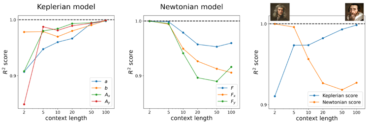 In the main paper, for the Kepler model, we showed that a transformer with a short context length (2) learns a Newtonian model, whereas a transformer with a long context length (100) learns a Keplerian model. What happens when we interpolate between these two extremes? Figure 10 shows that the transition is monotonic: increasing the context length yields models that are progressively more Keplerian and less Newtonian. For simplicity, the metrics in the rightmost plot are averaged across components (i.e., the Keplerian score averages over \(a,b,A_x,A_y\), while the Newtonian score averages over F,Fx,Fy).