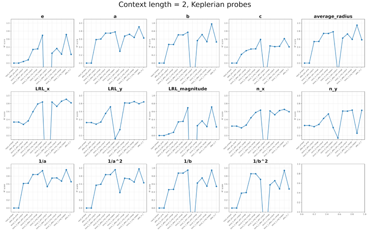 Figure 11. Probing results for context length 2. Top: Probes related to the Keplerian model. Bottom: Probes related to the Newtonian model.