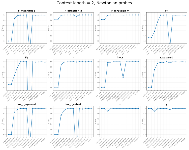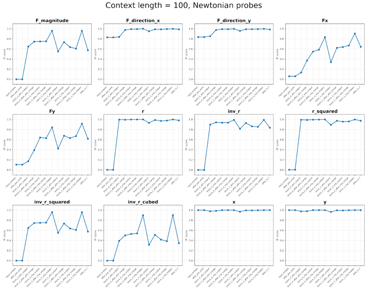 Newtonian world model We apply linear probing to search for linear directions in the model’s latent representations that correlate with force variables: force magnitude \(F ≡ ||\vec{F}||\), the \(x\)-component \(F_x\), and the \(y\)-component \(F_y\). We probe a wide range of internal activations, including the inputs and outputs of attention and MLP blocks (both before and after residual merging), as well as hidden states inside MLP modules. For each force-related target, we report the highest R2 across all layers (Results for R2 of each layer are included in Appendix C). Figure 6(a) (green bars) reveals that while context length 100 partially captures these force variables (\(R^2 \approx 0.9\)), only context length 2 yields a precise representation \(R^2 \approx 0.999\).