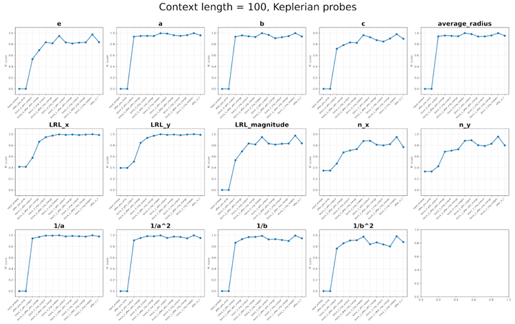 Figure 12. Probing results for context length 100. Top: Probes related to the Keplerian model. Bottom: Probes related to the Newtonian model.