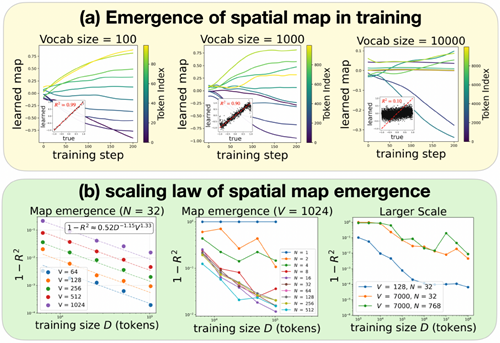 図3. 空間マップの出現はトークン化に大きく依存し、埋め込み次元には弱く依存する。(a) 学習済み埋め込みの進化、すなわち最終ステップ(200)における最適な線形デコード可能な方向に投影されたトークン埋め込み。左から右へ:語彙サイズ \(V = 100,1000,10000\)。各インセットは、真の座標と学習済み座標を示している。語彙サイズ \(V\) が小さい場合、空間マップは容易に出現するが、 \(V\) が大きい場合、空間マップの出現は困難になる。(b) 真の座標と学習済み座標の間の \(R^2\) で測定された空間マップの品質。左: \(1 − R^2\) は語彙サイズ V とトレーニング トークン D に関してスケーリング則に従います。中央: \(R^2\) は、埋め込み次元 \(N\) が 8 の臨界値を超えると飽和します。右: \(V\) または \(N\) を拡大しても空間マップの出現は改善されず、むしろ悪影響を及ぼします。