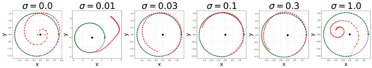 Figure 4. Error accumulation and fixing it by adding context noise in training. Each subplot shows the ground truth trajectory (blue solid circle), conditioning 50 points (green), and the generated 50 points (red). From left to right: training with different levels of context noise \(σ\). Naively training a regression-based transformer leads to severe error accumulation (left, \(σ = 0\)), whereas adding a reasonable amount of noise \(σ\) (e.g., \(σ = 0.1\)) to contexts during training substantially improves robustness.
