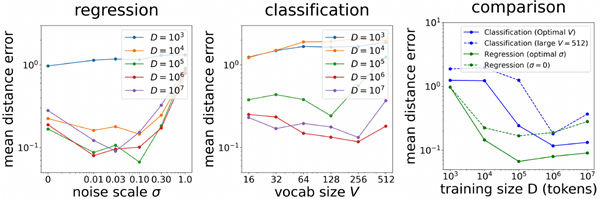 Figure 5 reports the mean distance error for both regression and classification models. In the left panel, we confirm that an intermediate noise scale \(σ\) yields the best regression performance. In the middle panel, we observe a sweet spot for vocabulary size \(V\) , with the optimal \(V\) increasing with the training size \(D\) In the right panel, regression models (solid green) consistently outperform classification models (solid blue) across all training sizes when hyperparameters are optimized (choosing \(V\) for classification and \)σ\) for re-gression). However, if \(σ\) is naively fixed to zero, regression models (dashed green) may underperform the best classifi-cation models (solid blue) at large training sizes – precisely the regime considered by Vafa et al. (2025).