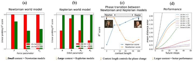 Keplerian world model This raises the question: what world model does a transformer learn when the context length is large? It is obvious that the model must have learned something meaningful in order to make accurate predictions. If we adopt Kepler’s geometric perspective orbits are ellipses (Kepler’s first law), we can first fit an elliptical equation based on all previous points and then predict the next state by continuing the curve. We refer to this global geometric approach as Keplerian world model, in contrast to Newtonian world model based on force com-putations (see Figure 1 right for illustrations). To test this hypothesis, we probe the model for key geometric param-eters of ellipses: semi-major axis a, semi-minor axis b, Laplace–Runge–Lenz vector \(\vec{A} = (A_x,A_y)\). Figure 6(b) shows that these geometric quantities are linearly encoded almost perfectly (\(R^2 \approx 0.998\)) when the context length is 100, whereas they are relatively poor (\(R^2 \approx 0.9\)) when the context length is 2. There is a phase transition between Ke-plerian and Newtonian models by varying context lengths, as shown in Figure 6(c) – while transformers with small context lengths preferentially learn Newtonian world mod-els, transformers with large context lengths preferentially learn Keplerian world models. Furthermore, Figure 6(d) shows that larger context lengths achieve lower prediction error, because the Keplerian model (global, geometry-based) is more robust to noise than the Newtonian model (local, force-based), hence making more accurate long-horizon predictions.