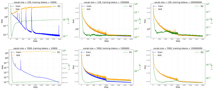 Figure 7. Training dynamics of the training loss, test loss, and \(R^2\) for the 1D sine-wave dataset, with vocabulary sizes 128,7000 and training token counts \(10^4,10^6,10^8\). When the training set is small, the learned map initially improves (lower \(1 − R^2\)) but subsequently degrades as overfitting sets in. Larger vocabulary sizes require more data to mitigate overfitting, as reflected by a larger train–test loss gap.