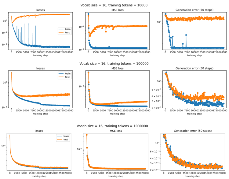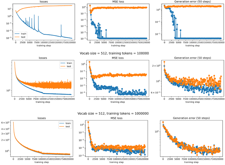 図8. ケプラー問題を分類タスク(次トークン予測)として定式化すると、パフォーマンスは語彙サイズとトレーニングトークン数の両方に依存します。各設定について、クロスエントロピー損失、実効MSE損失(真の点と予測トークンの中心間の距離の2乗として定義)、および次の50ステップで平均化された生成距離誤差のトレーニングダイナミクスをプロットします。トレーニングデータが限られている場合、語彙サイズが小さいほどパフォーマンスが向上します。