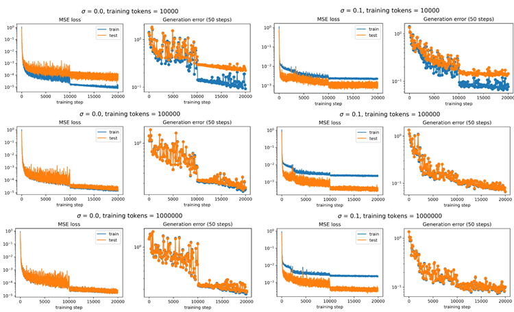 図9. ケプラー問題を回帰タスク(次状態予測)として定式化する場合、パフォーマンスはノイズスケールとトレーニングトークン数の両方に依存します。各設定について、次の50ステップにおける平均MSE損失と生成距離誤差のトレーニングダイナミクスをプロットします。トレーニング中に適度なレベルのコンテキスト内ノイズを導入すると、ノイズなしのトレーニングよりも優れた結果が得られます。