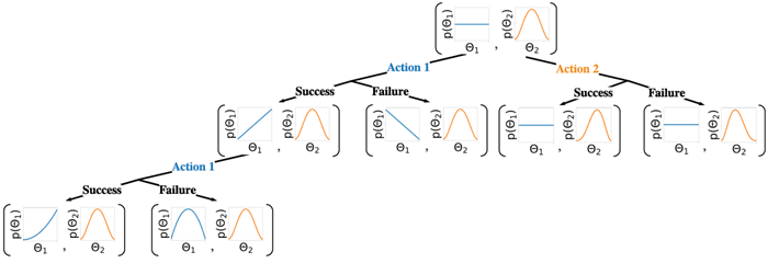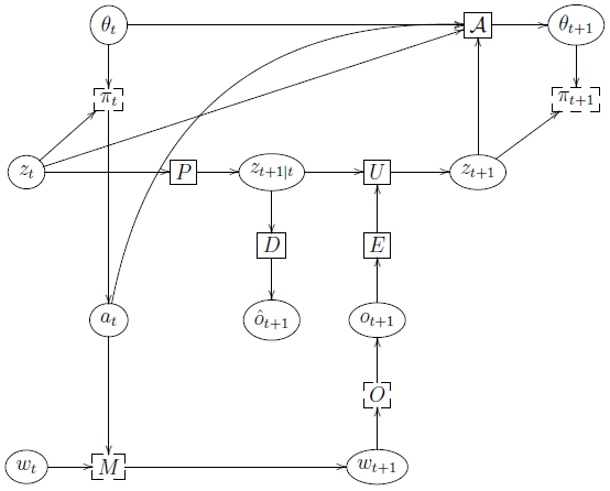 We see that, in general, there are three interacting stochastic processes we need to deal with: the environment's states \(w_t\) (which are usually affected by the agents actions); the agent's internal states \(z_t\) (which reflect its beliefs about the environment based on the observed data); and the agent's policy parameters \(\mathbf{θ}_t\) (which are updated based on the information stored in the belief state and the external observations).