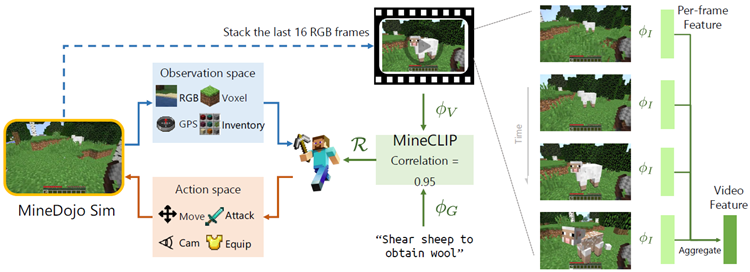 図1.5: MineClip報酬関数を用いて、エージェントがMineDojoシミュレータでMinecraftをプレイできるように訓練する方法を示した図。[Fan+22]の図4より。Jim Fan氏の許可を得て使用。