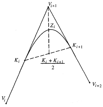 円錐スプラインの各円錐曲線は、2つの端点、2つの接線、および1つの追加点によって定義される。ノット \(K_i\) は、折れ線の頂点間に配置できる。 \[ K_i=(1-\nu_i)V_i+\nu_iV_{i+1} \tag{6.25} \] ここで\(\nu_i\)は0と1の間である。接線は、頂点\(V_i, V_{i+1}\)、\(V_{i+2}\)を持つ三角形によって定義される。追加の点は図6.10に示すように以下となる。 \[ Z_i=\gamma_i V_{i+1}+(1-\gamma_i)\frac{K_i+K_{i+1}}{2} \tag{6.26} \]
