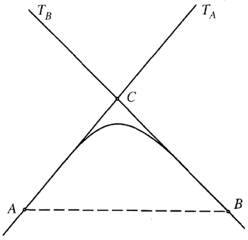 図6.10: 円錐曲線は、折れ線近似の3つの頂点から得られる2つの端点と接線、および1つの追加点によって定義される。