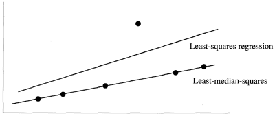 誤差が正規分布から生じていない場合、最小二乗法は最適な適合基準ではない。図6.12は、データセットに外れ値が含まれている場合に最小二乗回帰が遭遇する問題の例を示している。1つの外れ値だけでも、回帰直線は正しい位置から大きく離れてしまう。ロバスト回帰法では、データポイントのさまざまなサブセットを試し、最も適合度の高いサブセットを選択する。