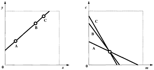 直線の場合、上に示したように、この直線上に \(n\) 個の点があるとすると、これらの点は図6.14に示すように、パラメータ空間における直線の族に対応する。これらの直線はすべて、パラメータ空間の点\((m,c)\)を通る。この点は、元の直線のパラメータを与える。