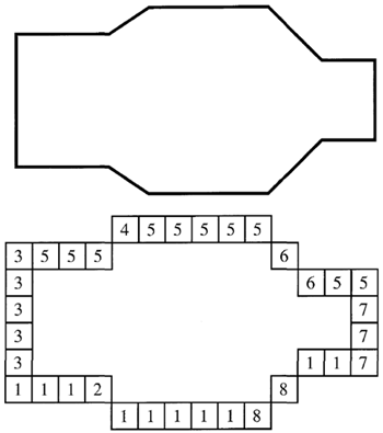 チェーンコードは、輪郭線に沿ったエッジポイントのリストを記録するための表記法である。チェーンコードは、エッジリスト内の各エッジにおける輪郭線の方向を指定するす。方向は、図6.1に示すように、8つの方向のいずれかに量子化される。リストの最初のエッジから始めて、輪郭線を時計回りに回り、次のエッジへの方向は、8つのチェーンコードのいずれかを使用して指定される。方向は、エッジの8次元のチェーンコードである。チェーンコードは、最初のエッジの座標と、後続のエッジにつながるチェーンコードのリストによってエッジリストを表す。曲線とそのチェーンコードを図6.2に示す。