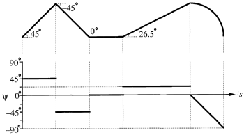 輪郭の傾きの表現は \(\Psi-s\) プロットとも呼ばれ、チェーンコードの連続バージョンのようなものである。チェーンコードで許可されている限られた接線方向ではなく、任意の接線方向を使用して輪郭を表現する。エッジリストの先頭から始めて、デジタル曲線の式を使用して接線と円弧長を計算するものとする。接線 \(\Psi\) と円弧長 \(s\) をプロットして、\(\Psi-s\) 空間での輪郭の表現を取得する。\(\Psi-s\) プロットは、輪郭の形状の表現である。たとえば、線分と円弧で構成される輪郭は、\(\Psi-s\) プロットでは線分の連続のように見える。\(\Psi-s\) プロットの水平線分は、輪郭の線分に対応する。 \(\Psi-s\) プロット内の他の方向の線分は円弧に対応する。\(\Psi-s\) プロット内の直線ではない部分は、他の曲線プリミティブに対応する。