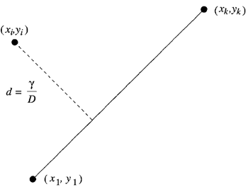 端点のリストを近似し、最初の端点と最後の端点 \((x_1,y_1)\) と \((x_k,y_k)\) を結ぶ線分の式は、端点間の直線の傾きが、最初の点と直線上の任意の点間の直線の傾きと同じであることに注目することで導き出せる。 \[ \frac{y-y_1}{x-x_1}=\frac{y_k-y_1}{x_k-x_1} \tag{6.9} \] 項を掛け合わせて並べ替えると、端点の座標でパラメータ化された線分の暗黙的な形が得られる。 \[ x(y_1-y_k)+y(x_k-x_1)+y_kx_1-y_1x_k= 0 \tag{6.10} \] 任意の点\((x_i,y_i)\)から直線までの距離は\(d = r/D\)である。ここで\(r\)は、点の座標を線分の式に代入することで計算される。 \[ r=x_i(y_1-y_k)+y_i(x_k-x_1)+y_kx_1-y_1x_k \tag{6.11} \] \(D\)は端点間の距離である(図6.4参照)。\(r\) の符号は符号変化回数 \(C\) を計算するために使用できる。正規化された距離は \(d/D\) である。正規化された最大絶対誤差は \(d/D\) である。 \[ \varepsilon=\frac{\max_i |d_i|}{D} \tag{6.12} \] ここで、\(d_i\) は直線とエッジリストの \(i\) 番目のエッジの位置との間の距離である。正規化された最大誤差は、直線とエッジの集合との適合度の尺度として頻繁に用いられる。これらの式はすべて、点の直線への垂直投影が直線内、つまり直線上と直線の端点間にあることを仮定している。これは本章全体を通して当てはまるが、他の場合には、線分の最も近い端点から点までの距離を計算するために式を修正する必要があるかもしれない。