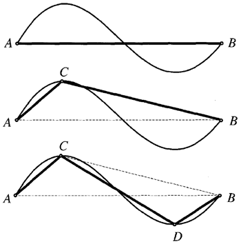 トップダウン分割アルゴリズムは、初期曲線から始めて、頂点を再帰的に追加する。図 6.5 に示す曲線を考えてみよう。初期曲線は、A と B でラベル付けされた最初のエッジ ポイントと最後のエッジ ポイント間の線分である。エッジ リスト内で直線から最も遠い点が検索される。正規化された最大誤差がしきい値を超える場合、線分から最も遠いエッジ ポイント (図 6.5 の点 C) に頂点が挿入される。分割アルゴリズムは、2 つの新しい線分とエッジ リストに再帰的に適用される。エッジ リストは、2 つの線分に対応する 2 つのリストに分割される。リスト内で各線分から最も遠いエッジ ポイントが検索され、ポイントが線分から離れすぎている場合は新しい頂点が追加される。折れ線分割アルゴリズムは、折れ線上のすべてのエッジ ポイントの正規化された最大誤差がしきい値を下回ると終了する。この再帰的な手順は非常に効率的である。セグメント分割は再帰的細分化とも呼ばれる。