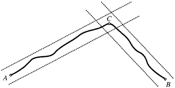 許容帯域アルゴリズムは、頂点の配置を決定するために異なる方法を使用する。中心線分から \(\epsilon\) の距離にあるエッジポイントを近似する線分に平行な2つの線分が計算される(図6.6を参照)。\(\epsilon\) の値は、近似直線からの許容される絶対偏差量を表す。新しいエッジは、許容帯域内にある限り、現在の線分に追加される。新しいエッジが線分に追加されるたびに、線分のパラメータが再計算される場合がある。近似線分は、許容帯域の辺に平行である必要はない。線分の端にある頂点は、次の線分の始点となる。このアプローチでは、通常、線分が多くなりすぎる。アルゴリズムが許容帯域の境界までエッジを処理するまで頂点が作成されないため、コーナーの位置と角度は正確に推定されない。