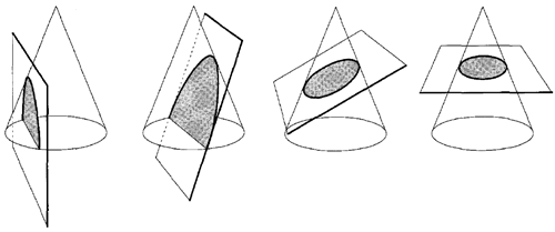 双曲線の暗黙的(代数的)形式は \[ f(x,y)=ax^2+2hxy+by^2+2ex+2gy+c= 0 \tag{6.24} \] 円錐曲線には、双曲線、放物線、楕円の3種類がある。円は楕円の特殊な例である。幾何学的には、円錐曲線は図6.8に示すように、円錐と平面の交差によって定義される。