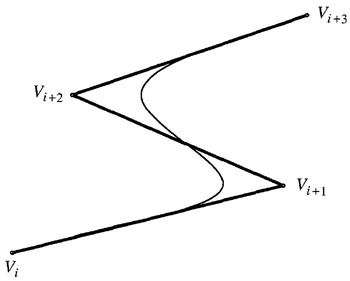 円錐曲線は、輪郭への折れ線近似において、3つの頂点間にフィットさせることができる。円錐曲線が結合されている箇所はノットと呼ばれる。円錐スプラインは、ノットにおける接線が等しく、曲線の隣接するセクション間の滑らかな遷移を実現する、端と端を繋いだ円錐曲線の列である。折れ線の頂点を \(V_i\) とする。円錐曲線近似は図6.9に示されている。